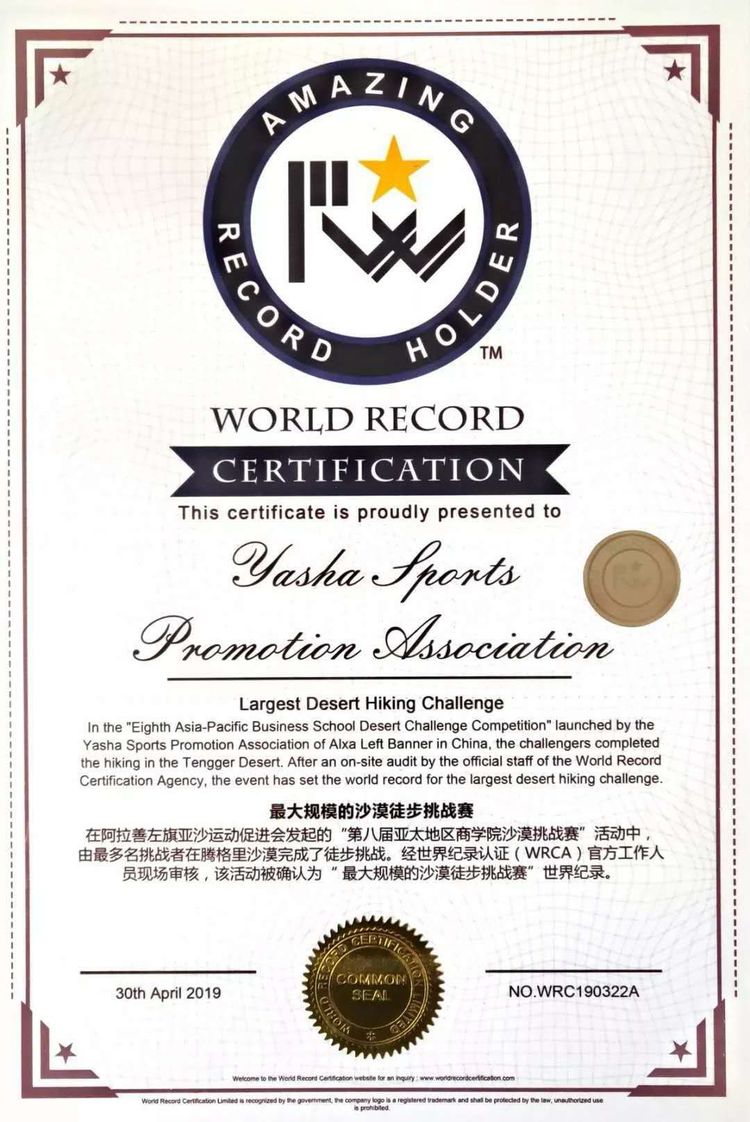 第八届亚太地区商学院沙漠挑战赛(简称沙8)共有来自中国大陆、台湾、香港、澳门、英国、澳大利亚等国家和地区的109所商学院的近3000名MBA学子参赛并完成了徒步挑战。以实际行动践行“环保、协作、坚持、责任”的赛事理念,挑战自我、超越极限实现与强者同行,成就团队和自我的目标。经世界纪录认证(WRCA)官方工作人员现场审核,该活动被确认为是“最大规模的沙漠徒步挑战赛“世界纪录,所有参赛队员将被纪录在这历史的一页。
