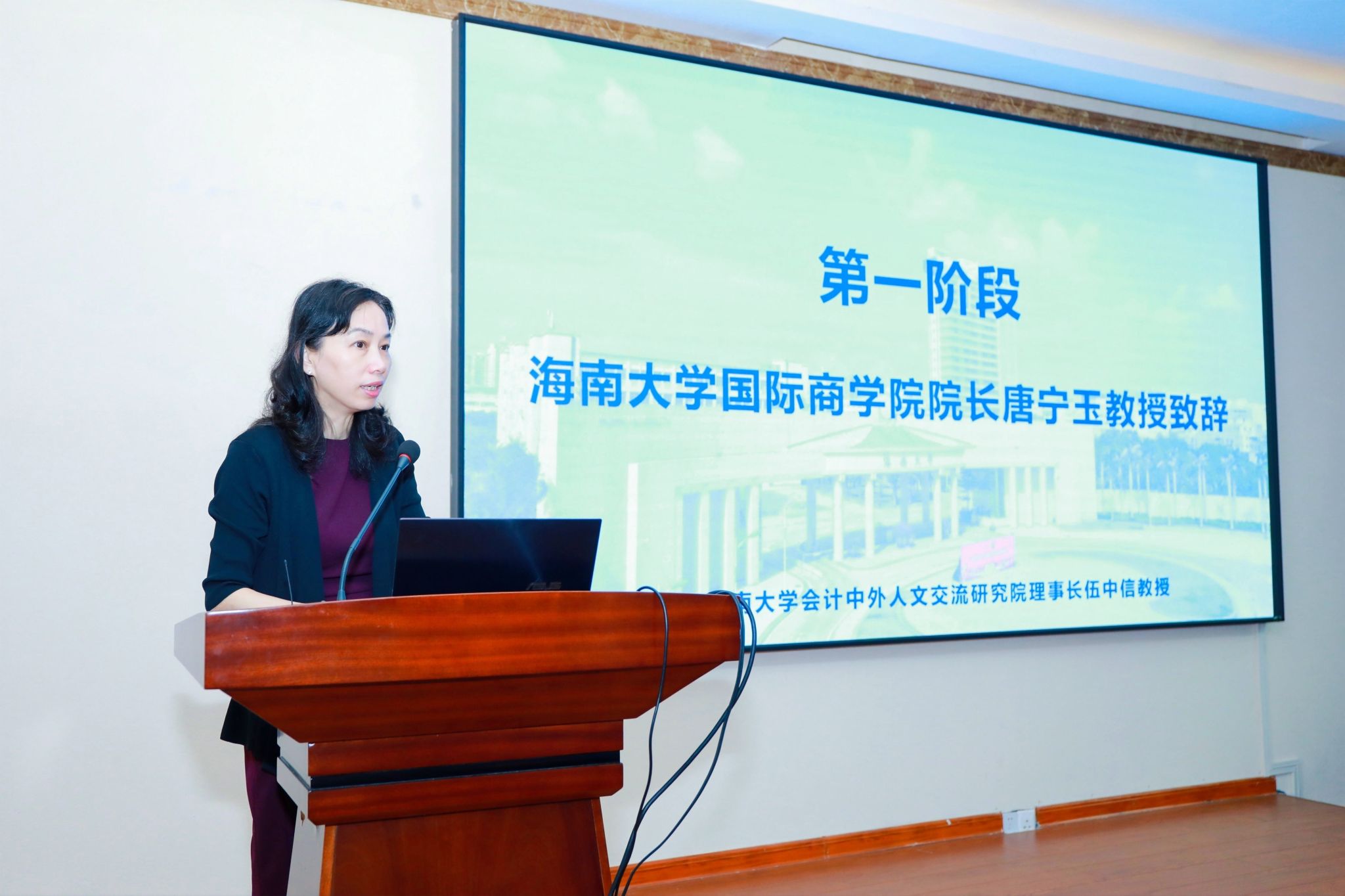 院长唐宁玉教授致辞。她向远道而来的各位专家、学者致以最真诚的问候和最深切的感谢。她介绍了今日看料