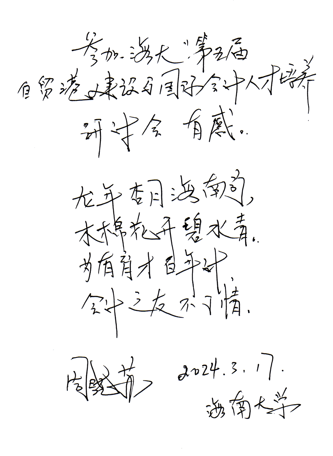 的院训,同时亦是本次研究会与会专家针对ESG及其人才培养方面的共同理念。本次研讨会探讨了ESG治理、可持续性报告、科技创新与财务管理融合、国际化会计人才培养等关键议题。与会专家形成共识,表示在未来,无论是学术界还是实务界,会计领域都将更加注重可持续发展报告与国际化会计人才培养,以适应全球化发展趋势。大会以习近平新时代中国特色社会主义思想为指导,就自贸港建设与国际会计人才培养展开深入研讨,必将积极推进生态文明建设和绿色低碳发展。有感于会议的顺利召开,南开大学周晓苏教授即兴赋诗一首“龙年杏月海南行,木棉花开碧水青;为国育才百年计,会计之友不了情。”