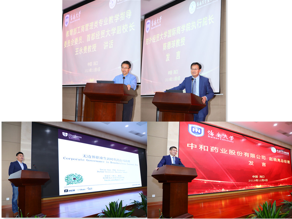 执行院长陈德球、英国杜伦大学商学院教授管延军、对外经贸大学国内合作办公室副主任李瑞芳、海南省社会科学界联合会规划办主任黄朝阳、中和药业股份有限公司总经理赵晓亮、我校相关职能部门和兄弟学院负责人、学院院长林肇宏、党委书记邢谷川等领导班子成员出席会议,学院相关教师代表、研究生和本科生代表等100余人参加活动。 詹兴文代表海南省社科联、社科院致以衷心的祝贺。他指出,企业是经济活动的基本主体,公司治理涉及企业的组织架构、财务管理、人力资源管理、品牌建设、流通渠道设计等问题,提高公司治理成效非常重要。当前,海南正在全岛建设自由贸易试验区,逐步探索、稳步推进中国特色自由贸易港建设,制度创新、营商环境建设和商事制度改革等工作正在如火如荼地进行,这给立足海南开展公司治理研究提供了独特优势和一片沃土,在海南自贸区(港)建设的伟大实践中开展公司治理研究大有可为、正逢其时。今日看料