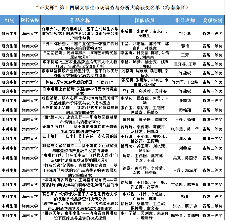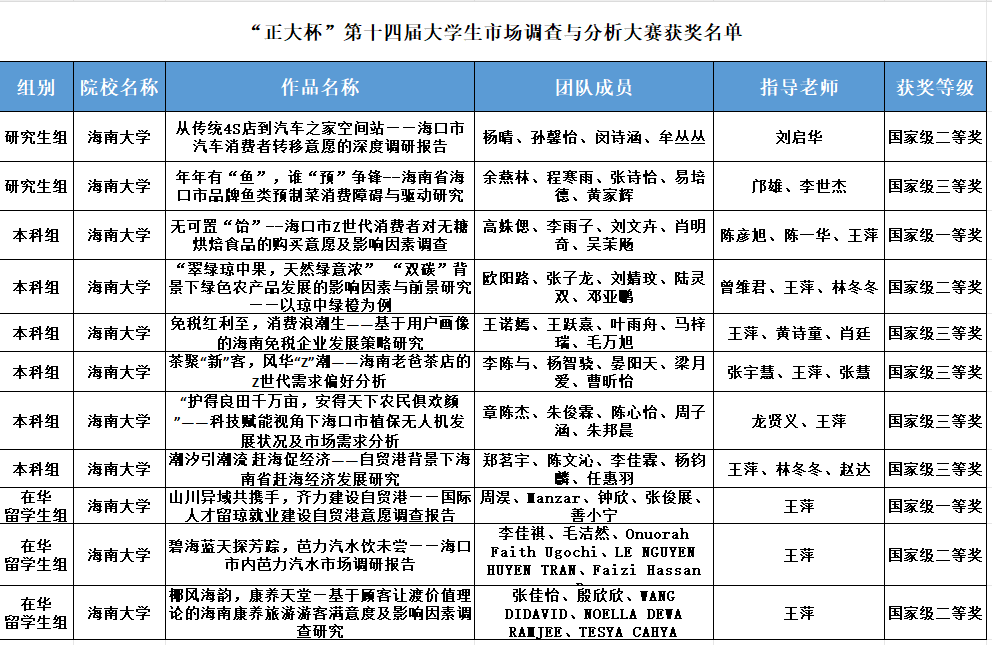 荣获多个奖项,其中,研究生组获国家级二等奖1项,三等奖1项,海南赛区一等奖3项,二等奖2项,三等奖2项;本科生组获国家级一等奖2项,二等奖1项,三等奖4项,海南赛区一等奖5项,二等奖6项,三等奖1项;在华留学生组国家级一等奖1项,二等奖2项的优秀成绩。