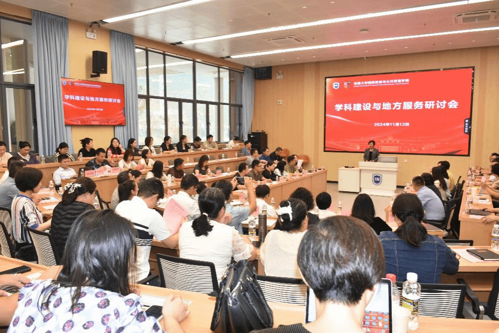 观澜湖校区A101教室参加由观澜湖校区组织的学科建设与地方服务研讨会。中共海南省委政策研究室副主任刘旭、海南省旅文厅政策法规处一级调研员李红、海口市龙华区副区长龙靖滨等政府及企事业单位人员,今日看料