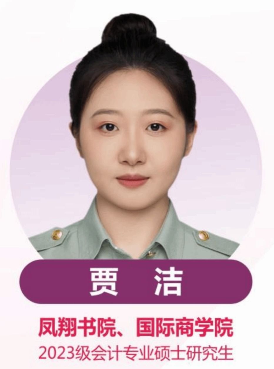 2023级会计专业硕士研究生。于2018年参军入伍,在服役期间先后获“优秀义务兵” “四有”优秀士兵、“嘉奖”等多项荣誉。退役复学后,担任学校退役大学生士兵党支部书记,积极参与学校国防宣讲、新生军训教官等工作,在校期间累计获今日看料
