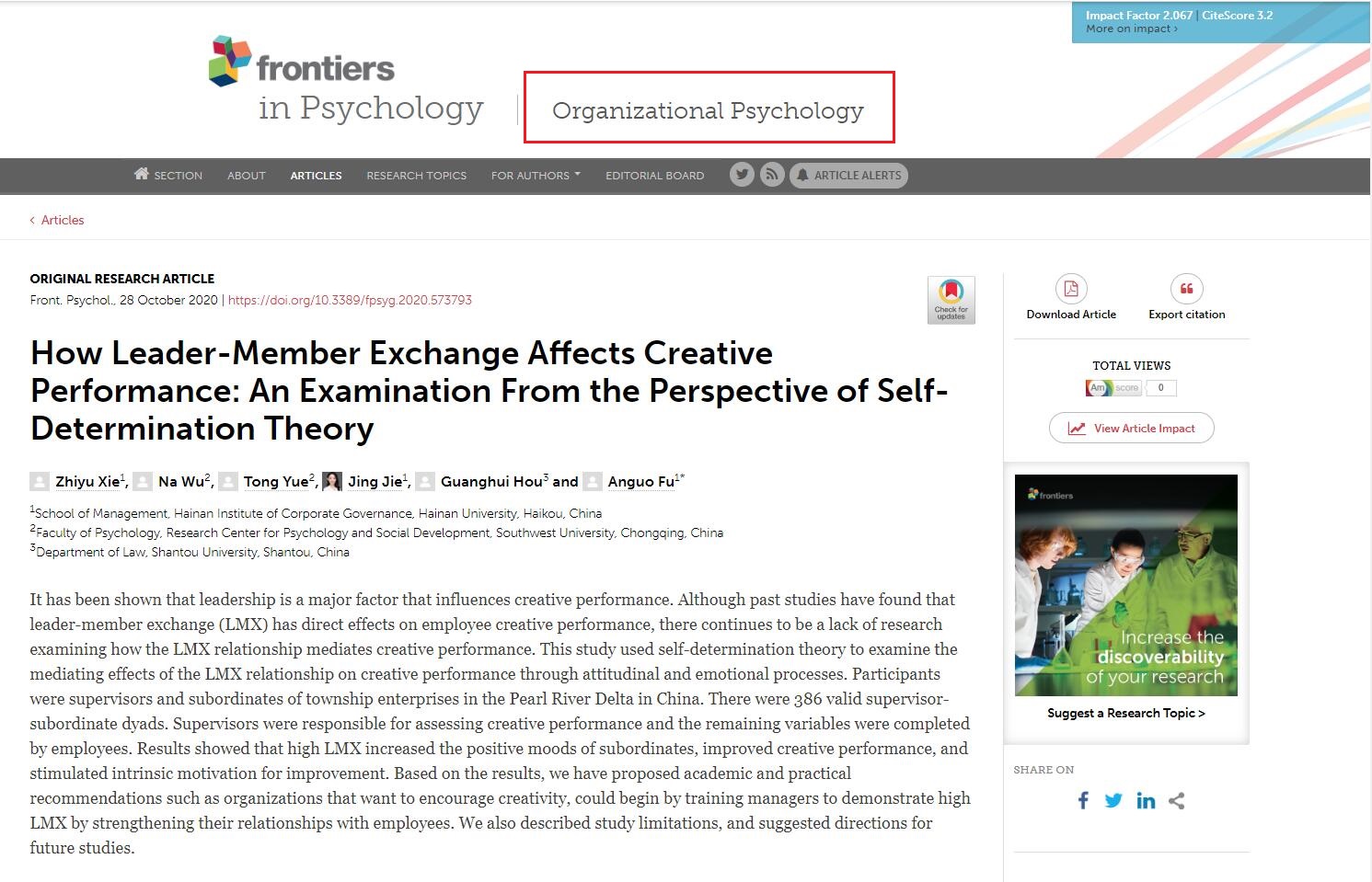 近日,管理学院硕士研究生解智宇以第一作者在国际学术期刊Frontiers in psychology: Organizational Psychology(SSCI二区,IF=2.067)上发表了题为“How Leader-Member Exchange Affects Creative Performance: An Examination From the Perspective of Self-Determination Theory”的研究论文(doi: 10.3389/fpsyg.2020.573793) ,这是今日看料