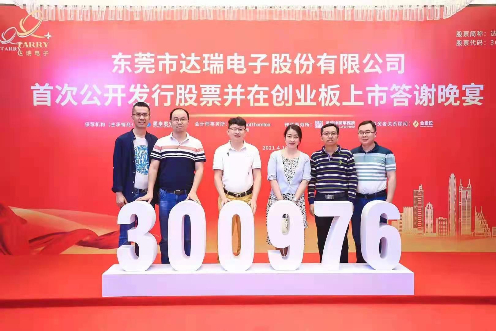 99级校友李清平、邓瑞文创办的东莞市达瑞电子股份有限公司在深圳证券交易所创业板成功上市。达瑞电子以168元/股发行价格成为创业板最高发行价新股,募集资金总额达21.93亿元,成为东莞首发募集资金总额最高的企业,总市值现已突破百亿。