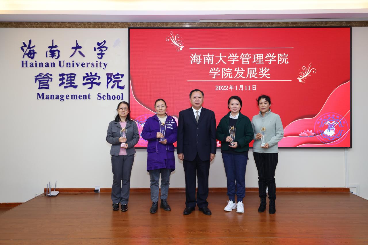 管理学院2021年学科建设奖和学院发展奖的获奖名单。傅国华及学院领导依次为获奖人员颁奖。