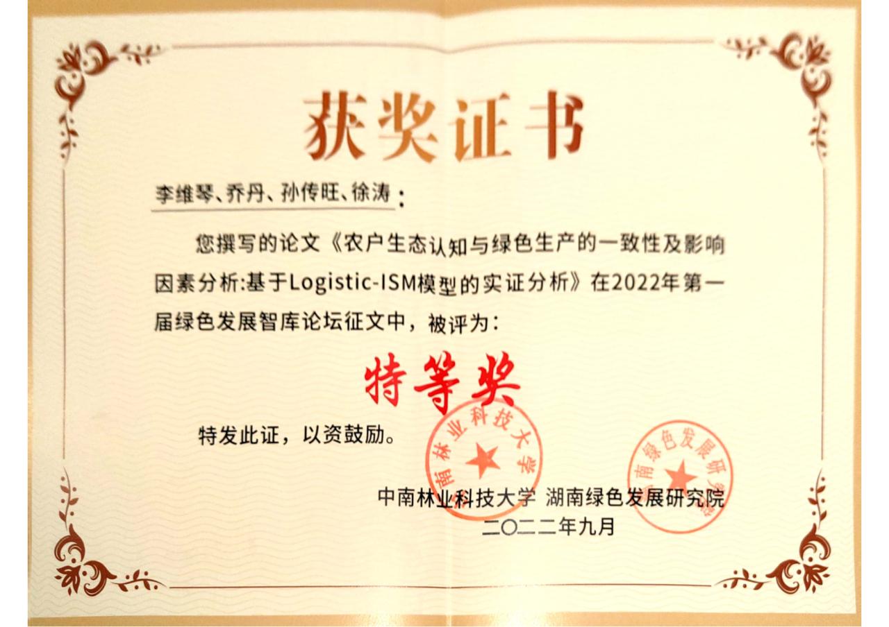 教师徐涛、孙传旺和乔丹共同指导的2021级农林经济管理专业硕士研究生李维琴撰写的《农户生态认知与绿色生产的一致性及影响因素分析:基于Logistic-ISM模型的实证分析》一文获得“特等奖”,李维琴受邀参加线下研讨会;由今日看料