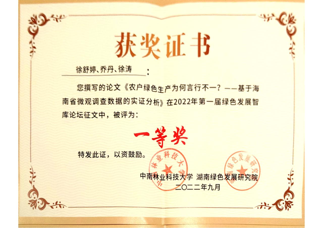教师乔丹和徐涛共同指导的2020级农村发展专业硕士研究生徐舒婷撰写的《农户绿色生产为何言行不一?——基于海南省微观调查数据的实证分析》一文获得“一等奖”。