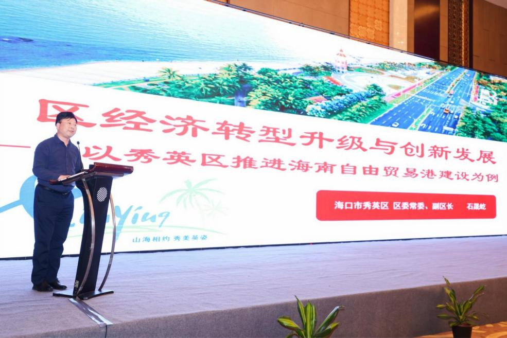 秀英区委常委、常务副区长石晟屹作了题为《区经济转型升级与创新发展》的主题发言。他重点讲解了海口市秀英区的概况、重点建设项目、投资载体和主要招商领域等主题。