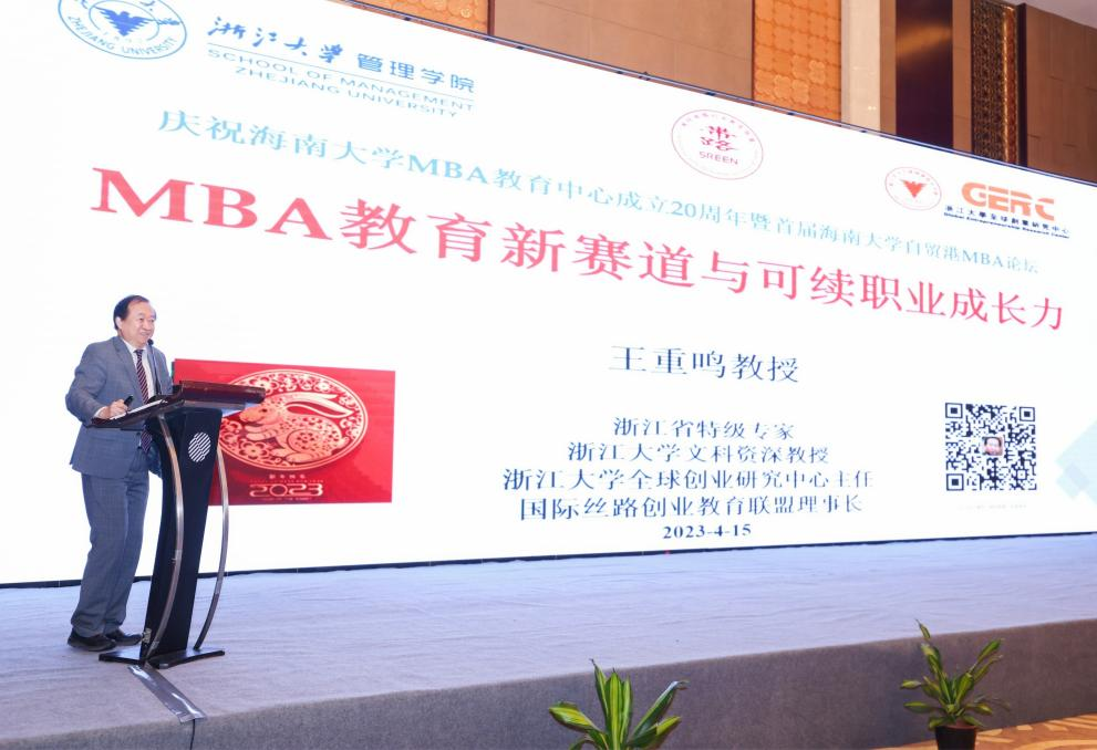 2022级MBA学生、三亚卫视新闻联播主播吴迪主持。浙江大学全球创业研究中心主任、浙江大学人文社会科学资深教授王重鸣作了《MBA教育新赛道与可续职业成长力》的主题发言,重点讲述了他提出的可续职业成长力的内涵和领导力的新结构,包括数智领导力和绿色领导力等。