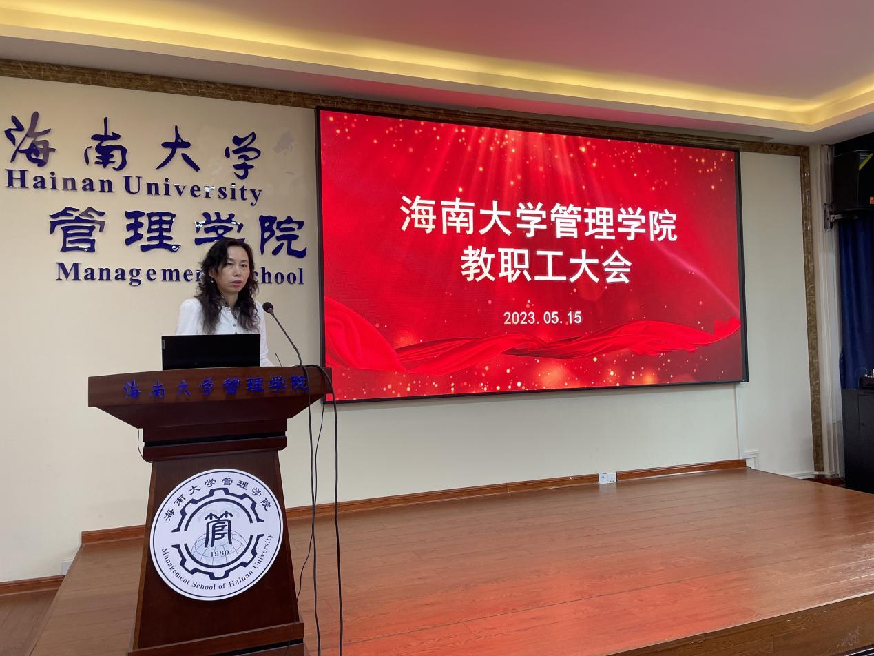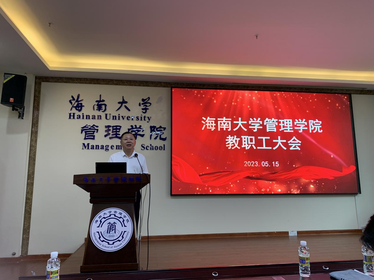 管理学院院长唐宁玉、党委书记邢谷川、学院领导班子及全体教职工出席会议。学院党委书记邢谷川主持会议。