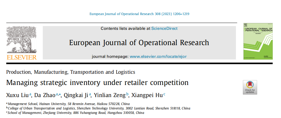 近日,管理学院赵达教授团队在国际顶级学术期刊European Journal of Operational Research(JCR Q1;ABS4;IF:6.363)上发表题目为" Managing strategic inventory under retailer competition "的研究论文,探讨了存在下游水平竞争的供应链结构中策略性库存发挥的作用,并进一步分析了其对供应链成员决策和利润的影响。