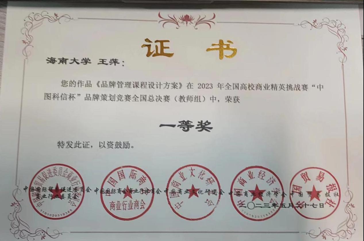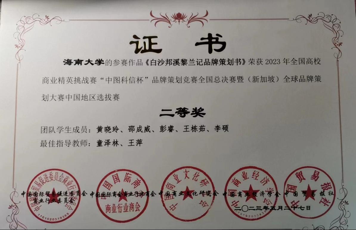 管理学院师生5月28日闭幕的2023年全国高校商业精英挑战赛“中图科信杯”品牌策划竞赛全国总决赛暨(新加坡)全球品牌策划大赛中荣获佳绩。其中,教师组获全国一等奖,学生组获全国二等奖2项,同时,“海南天然茶叶有限公司”和“白沙邦溪黎佳山兰酒坊”两家企业获得优秀企业奖,“海南天然茶叶有限公司”还获得最具社会责任企业奖,这两家是管理学院在2023年承办的海南省乡村产业振兴带头人培育“头雁”项目的企业,通过比赛,助力品牌,赋能企业,推动了两家企业的品牌影响力,实现了管理学院的产学融合。
