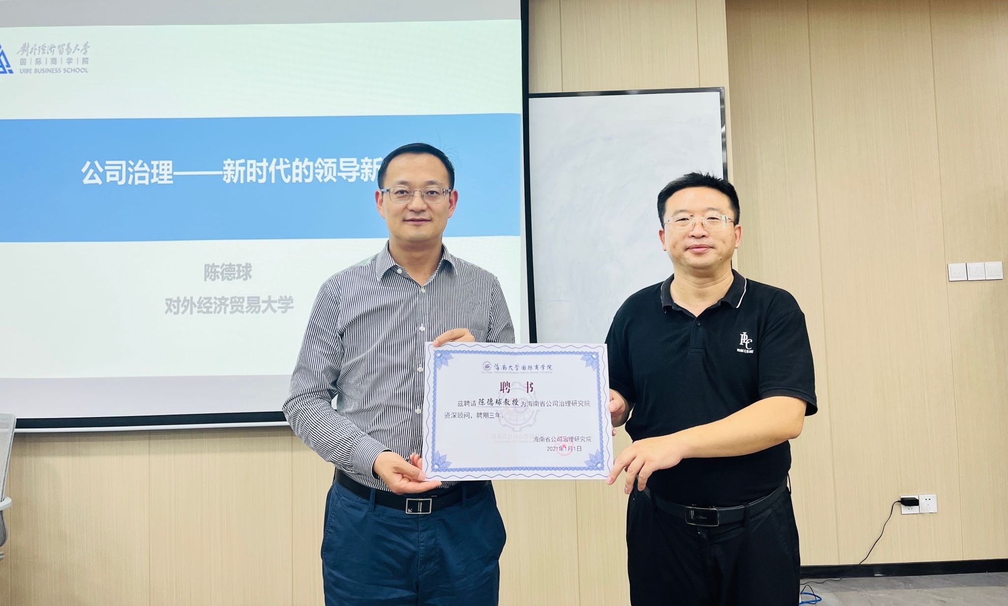副院长付景涛教授主持了讲座。在讲座开始前,付景涛教授代表海南省公司治理研究院向陈德球教授颁发了资深顾问聘书。
