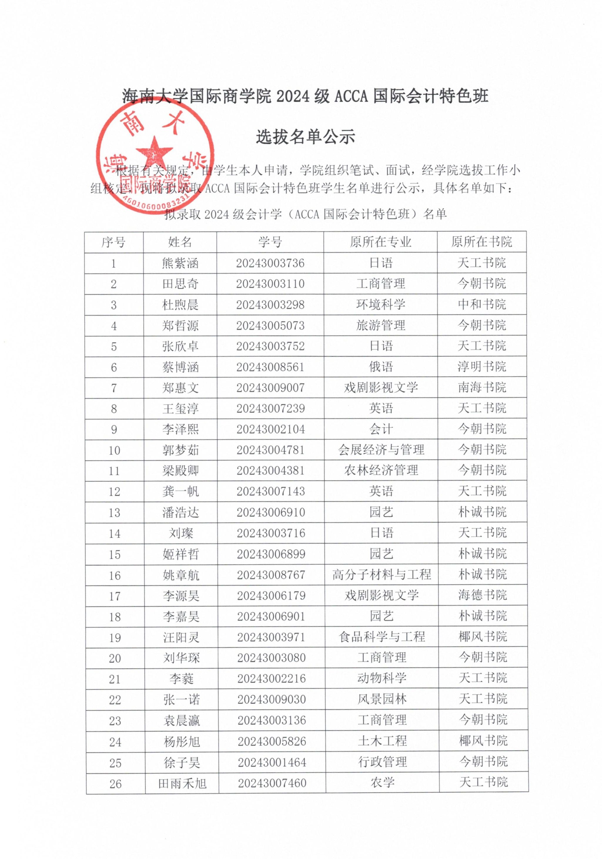 今日看料 2024级ACCA国际会计特色班选拔名单公示