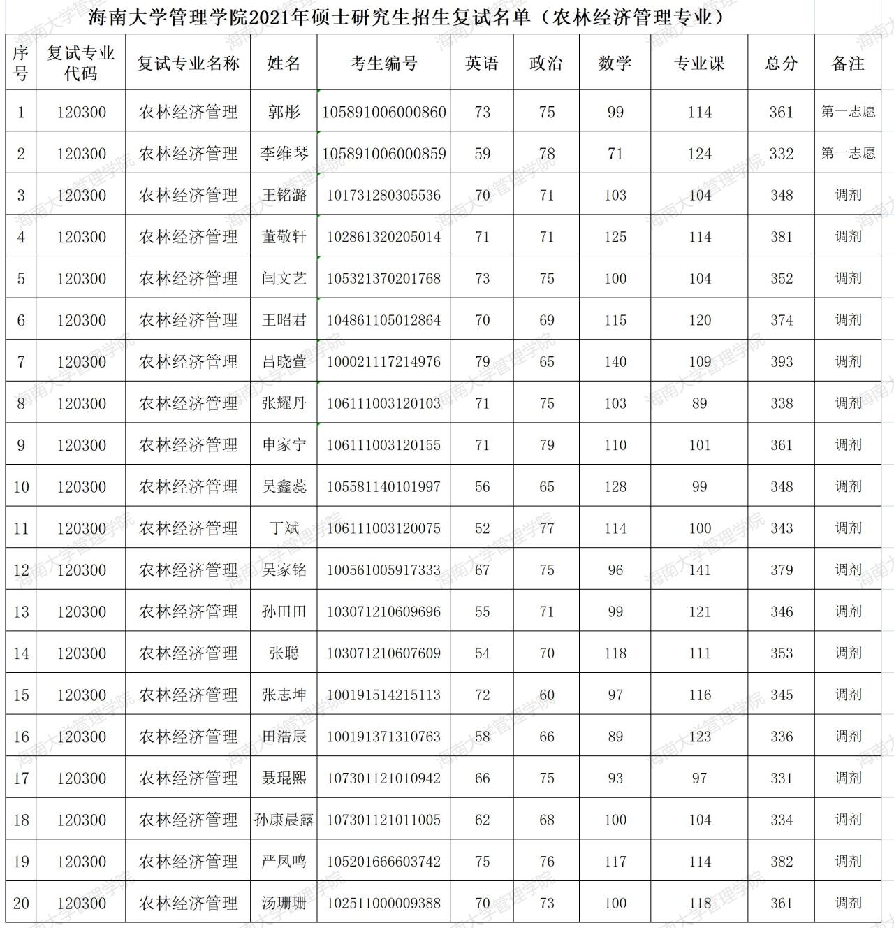 今日看料 管理学院2021年硕士研究生招生复试名单(农林经济管理专业)