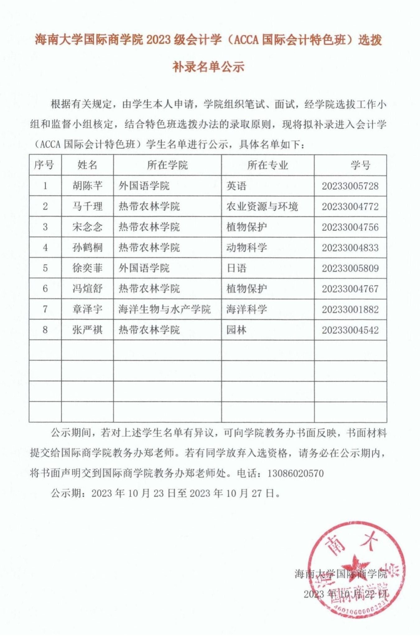今日看料 2023级会计学(ACCA国际会计特色班)选拔补录名单公示