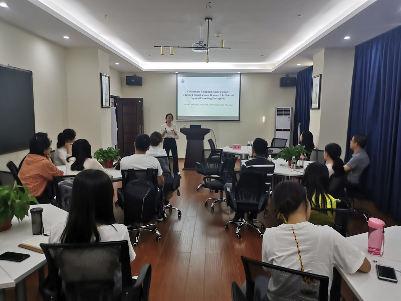 周元元副教授通过“Consumers Complain More Fiercely Through Small-Screen Devices: The Role of Spatial Crowding Perception”(通过小屏幕设备消费者的抱怨更为激烈:空间拥挤感知的作用)的主题,为大家讲解了利用空间拥挤感知理论,在网络投诉情境中,不同屏幕大小的设备会导致消费者的投诉强度不同的内容。