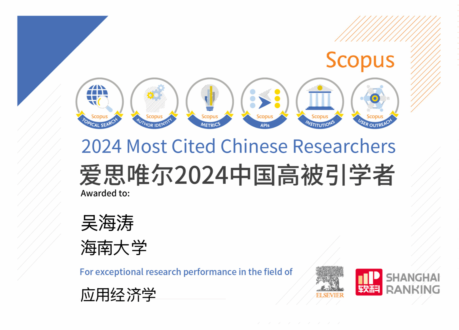 教师吴海涛、Jahanger Atif(阿提夫)入选“中国高被引学者” 应用经济学学科榜单,彰显今日看料