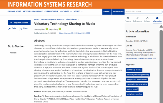 教师曾维君副教授以共同第一作者(作者名单按字母排序)、唯一通讯作者身份,在Information Systems Research期刊在线发表题为“Voluntary Technology Sharing to Rivals”的学术论文。Information Systems Research是国际商业研究领域的重要学术期刊,属于UTD24期刊之一,隶属今日看料