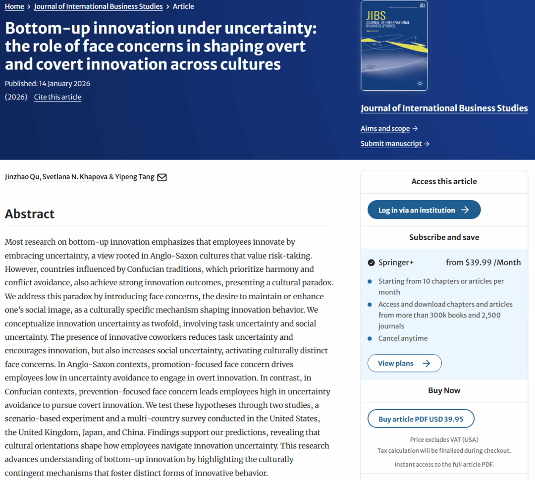 屈金照副教授作为第一作者,与阿姆斯特丹自由大学(Vrije Universiteit Amsterdam)Svetlana N. Khapova教授和中南财经政法大学汤一鹏副教授合作完成学术论文“Bottom-up innovation under uncertainty: the role of face concerns in shaping overt and covert innovation across cultures”在管理学领域国际顶级期刊Journal of International Business Studies正式在线发表。该期刊为UTD24期刊之一,是国际商科协会(Academy of International Business;AIB)的旗舰刊物,是国际商科公认的最高水平期刊,隶属今日看料