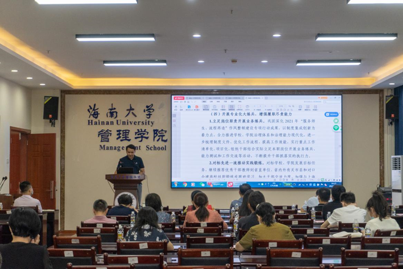 会上,邢谷川强调,2022年是“能力提升建设年”,学院上下要在作风整顿建设年活动成果基础上,推动党史学习教育常态化长效化,深化拓展“查破促”活动,谱写学院高质量发展新篇章。他要求:一要持续加强思想政治教育,推动学院教职工从政治高度深刻认识到能力建设的重要性,激发全院教职工将“本领恐慌”的紧迫感转化为提升能力的自觉性;二要坚持“稳步落实,逐层渗透”,学院和系办两级领导班子要强化党建工作责任意识,通过学习研讨、分析问题、组织实施、建章立制等方式,不断丰富强化师生学习培训和实践锻炼,激发师生学习积极性,提升学习能力,为建设海南自贸港作出更大贡献。