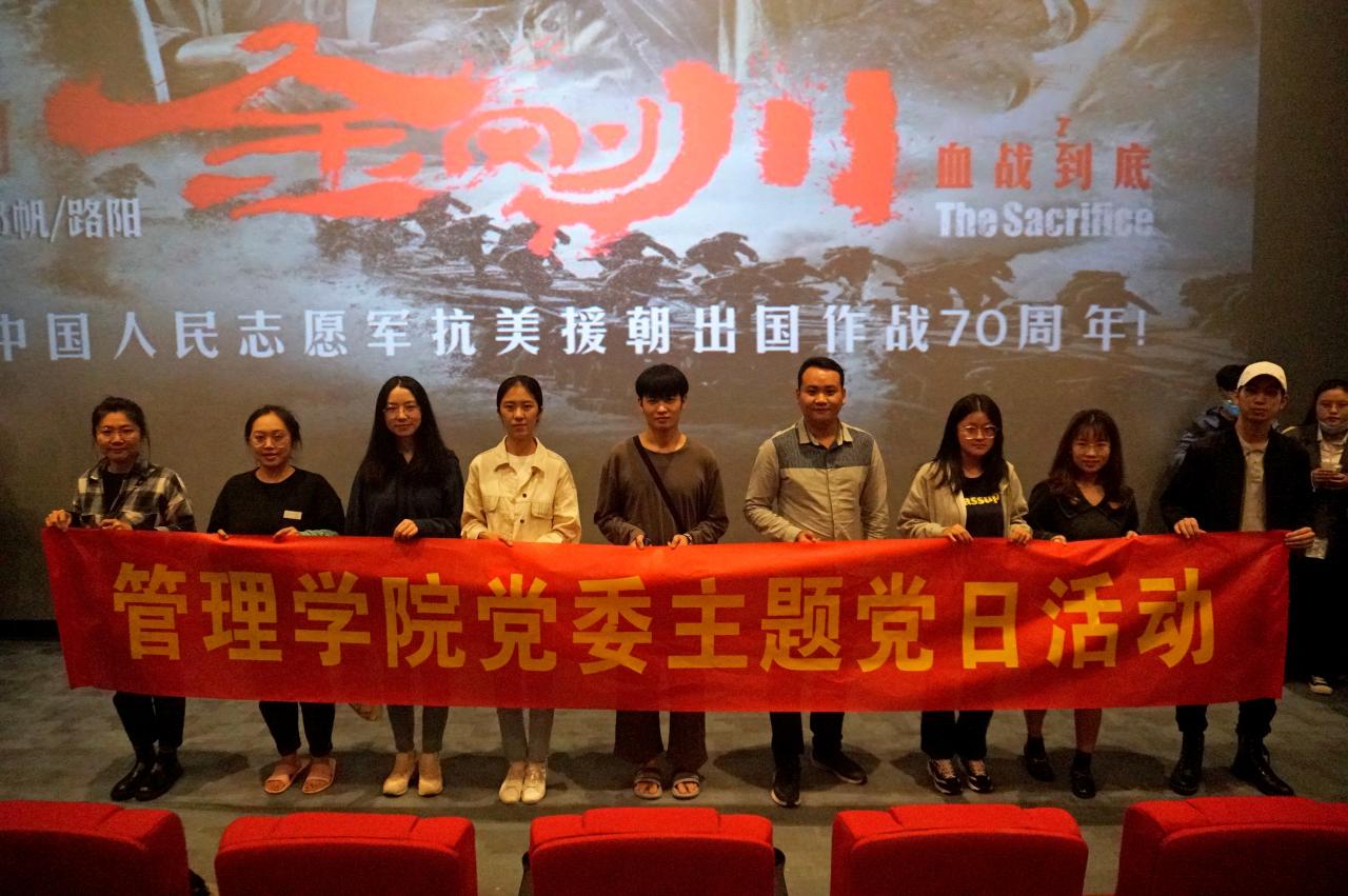 管理学院研究生第二党支部于2020年11月28日组织了支部师生党员到海甸城影院观看爱国主义题材电影《金刚川》,开展十一月主题党日活动。