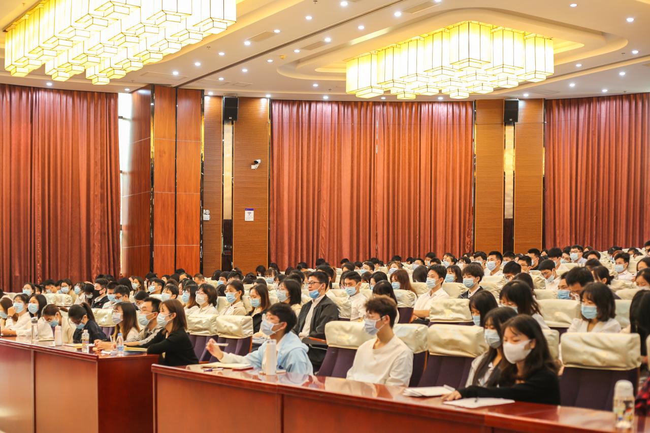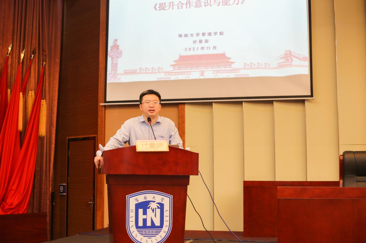 管理学院分党校2021年下半年党课培训第一讲于社科楼二楼报告厅开展,学院党委委员、副院长付景涛主讲,主题为《提升合作意识与能力》。学院116名发展对象和全体预备党员参训。