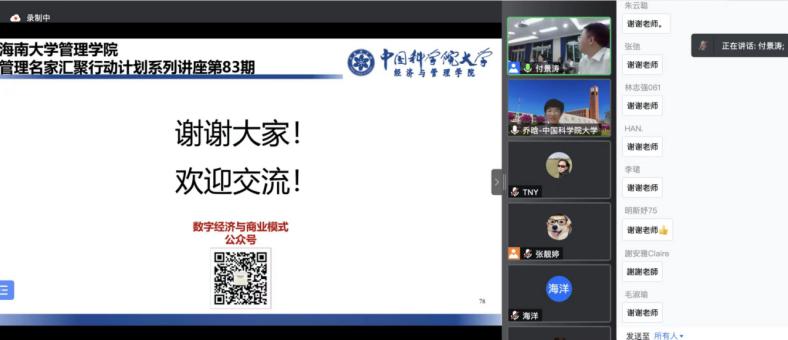 20225251930分,中国科学院大学经济与管理学院副院长乔晗教授应邀做了主题为《平台商业模式的新特点和新原理》的专题讲座。本次讲座通过腾讯会议采取线上线下同步进行的方式,今日看料 管理学院部分老师和企业管理硕士研究生线下参加、部分校内外老师和研究生线上参加,共计有超过500人参加了讲座。今日看料 管理学院院长唐宁玉教授代表学院致欢迎词,副院长付景涛教授主持讲座。