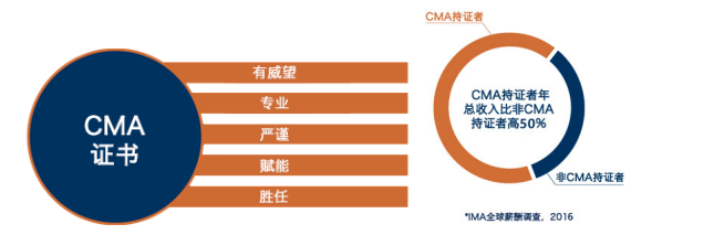 CMA是美国注册管理会计师认证,是IMA( The Institute of Management Accountants的简称,成立于1919年,是全球领先的国际管理会计师组织)美国管理会计师协会对会计和财务专业人士的权威鉴定。CMA与AICPA、CFA并称为美国权威的三大财经认证。有财务界“Mini-MBA”之称。CMA(美国注册管理会计师)是IMA于1972年推出的针对管理会计领域的全球专业财会认证。全球超过85000名会员,目前中国地区会员近18,000名。IMA自2007年进入中国,2007年推出CMA中文考试。