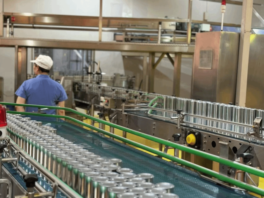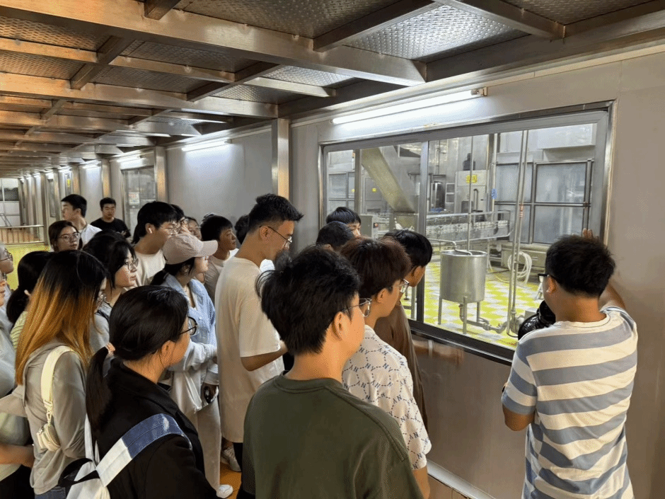 50名学生组成游学队伍在椰树集团参观负责人的带领下,参观了世界上唯一一条全自动化椰汁生产线。