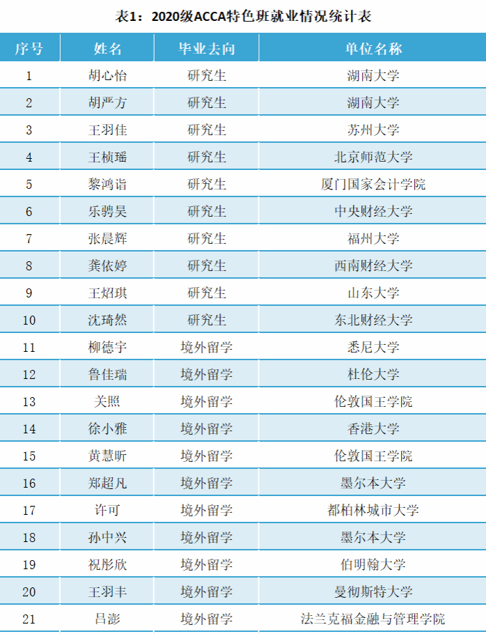 值得一提的是,尽管ACCA方向班的同学在入学时的录取分数并不是最高的,但他们的升学率却是全学院最高的,这一事实从侧面证明了ACCA项目的办学成果是显著的。
