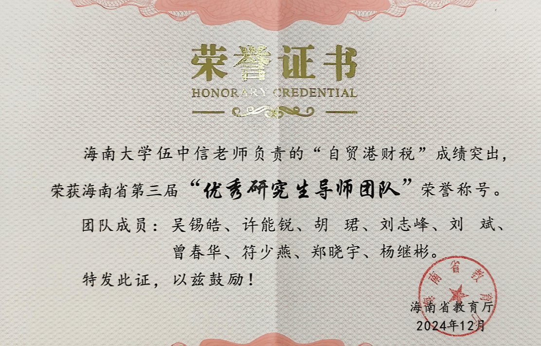 伍中信教授带领的“自贸港财税”研究团队在海南省教育厅举办的第三届“优秀研究生导师团队”评选中脱颖而出,荣获“优秀研究生导师团队”荣誉称号。这一荣誉不仅是对团队学术成果的高度认可,也是对今日看料