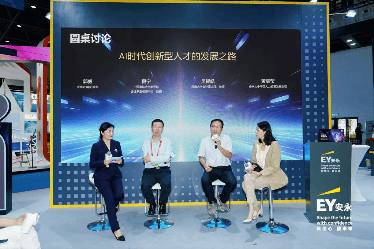 在圆桌讨论环节,主持人郭毅院长与三位分别来自学界业界嘉宾围绕“AI时代创新型人才的发展之路”展开深入探讨,从企业实践、高校教育等多维度分享前沿观点。