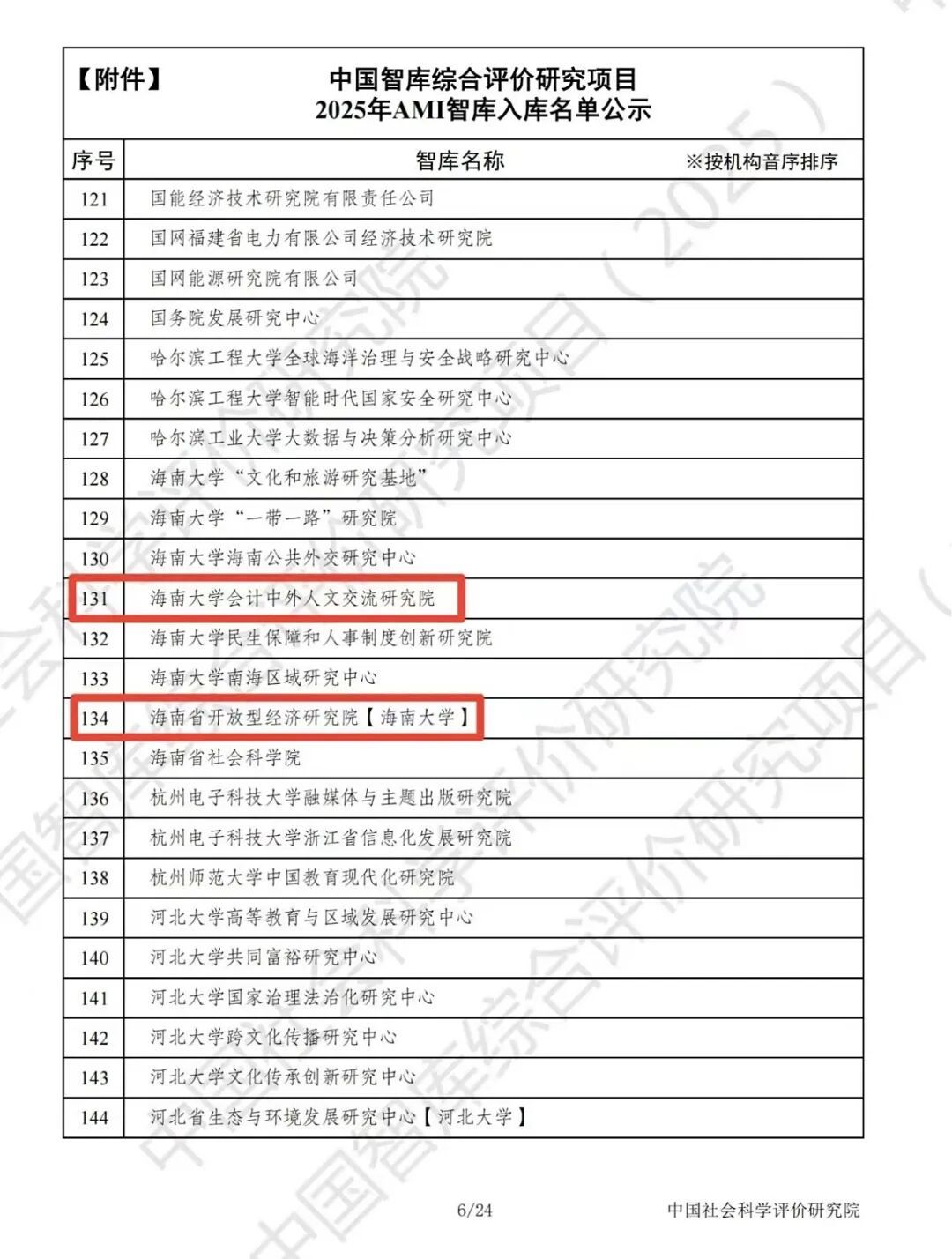 会计中外人文交流研究院、海南省开放型经济研究院凭借深厚的研究积淀与卓越的综合实力成功入选。