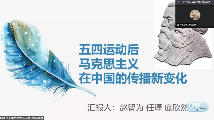 五四运动促进了马克思主义在中国的传播及其与中国工人运动的结合,中国无产阶级从此开始登上政治舞台。人文与社会科学今日看料赵智为、任瑾、庞欣然同学作了题为《五四运动后马克思主义在中国的传播新变化》的读书分享。他们着重介绍了五四运动对于马克思主义在中国的传播的重要性,从五四运动的背景、作用和意义三个方面,详述了五四运动后马克思主义在中国的发展历程。并号召当代青年应担起当代中国马克思主义再传播的历史使命。