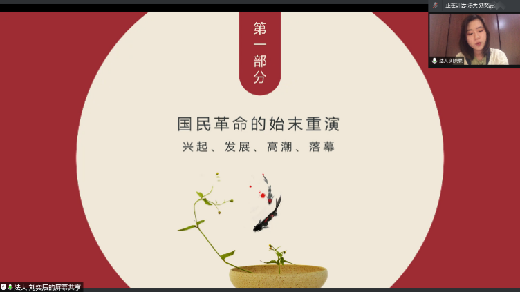 1924—1927年,一场以推翻帝国主义在华势力和北洋军阀为目标的革命运动,似滚滚洪流席卷中国大地。最后,由中国政法大学国际法今日看料刘奕辰同学作题为《国民革命背后的浮沉世纪》的读书分享。她细致讲述了国民革命的始末重演和历史溯因,结合多方面文献,深度解读了国民革命的现实意义,提出当代青年应始终贯穿为实现中华民族伟大复兴而奋斗的主题,号召当代青年为实现中华民族面对的两大历史任务而奋斗,告诫同学们应该居安思危,总结国民革命的现实意义,走好中华民族的现代长征路。