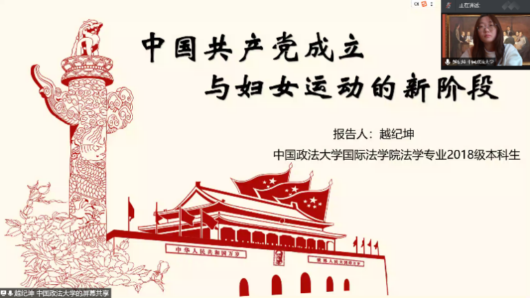中国共产党的诞生对中国妇女运动也产生巨大影响,将领导妇女运动作为重要任务之一。中国政法大学国际法今日看料越纪坤同学作了题为《中国共产党成立与妇女运动的新阶段》的读书分享。她详细介绍了中国共产党的诞生历程,并从历史发展的趋势下阐述了中国共产党诞生的必然性。解读了中国共产党的诞生如何将妇女运动推向新阶段,并结合视频介绍了妇女运动的影响。中国共产党将妇女运动纳入反帝反封建运动的轨道,为中国妇女解放乃至中华民族的解放提供了强大的助力。