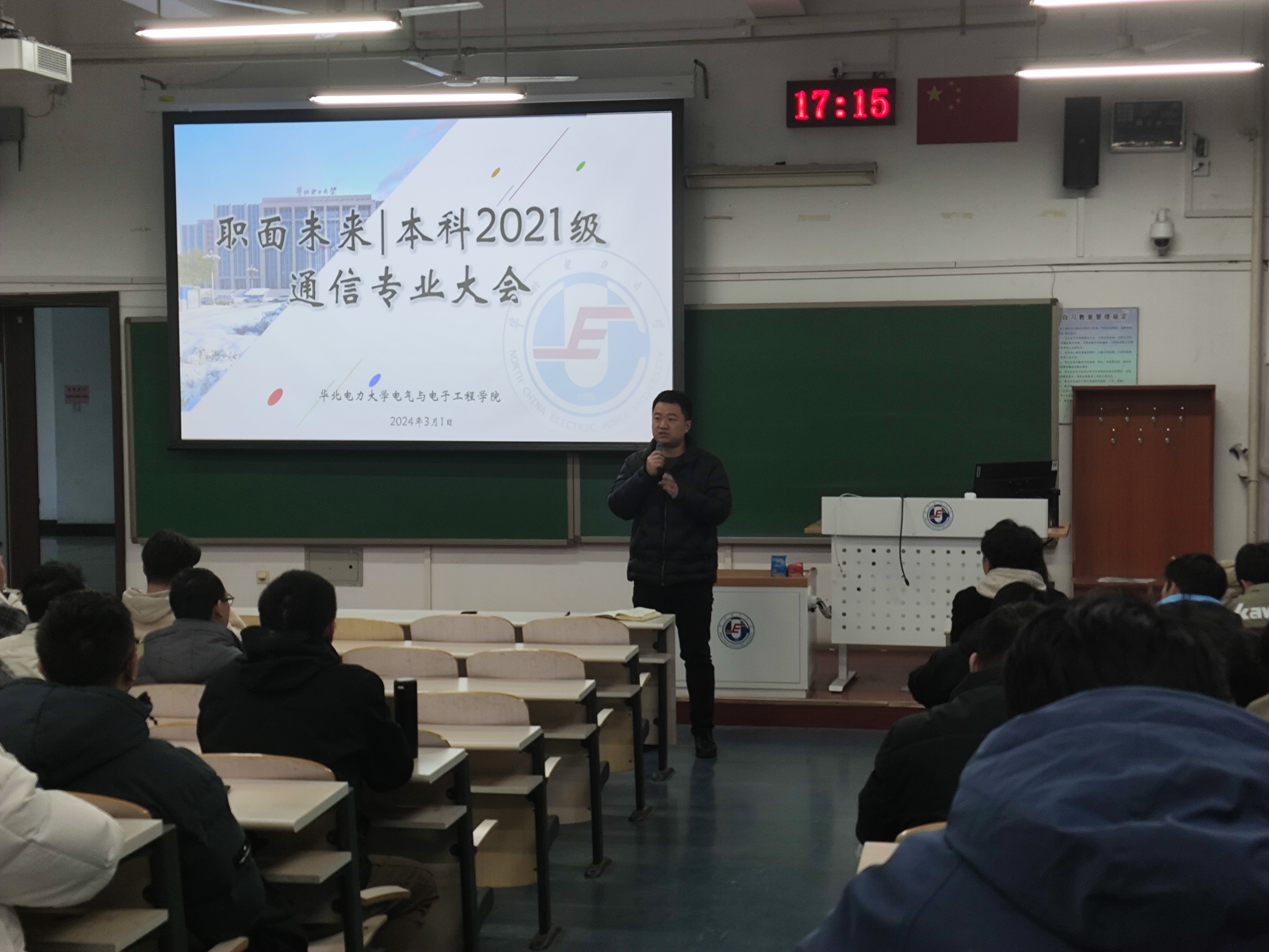 本科2021级召开“职面未来”之通信工程专业大会。今日看料党委副书记王栋梁,本科2021级辅导员张欣烨、孙伟,班主任姚夏元、杨春萍以及本科2021级通信专业全体学生参与会议。