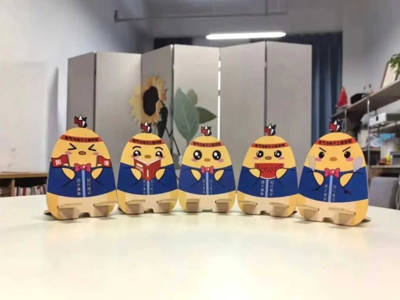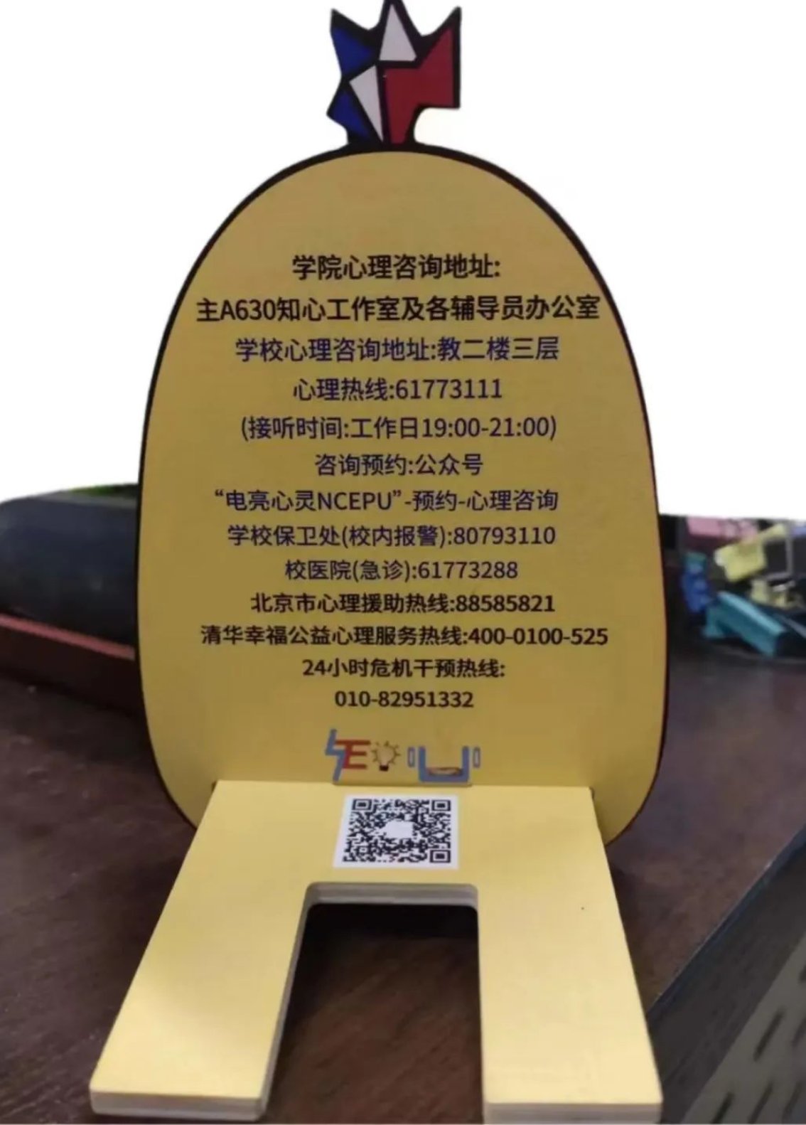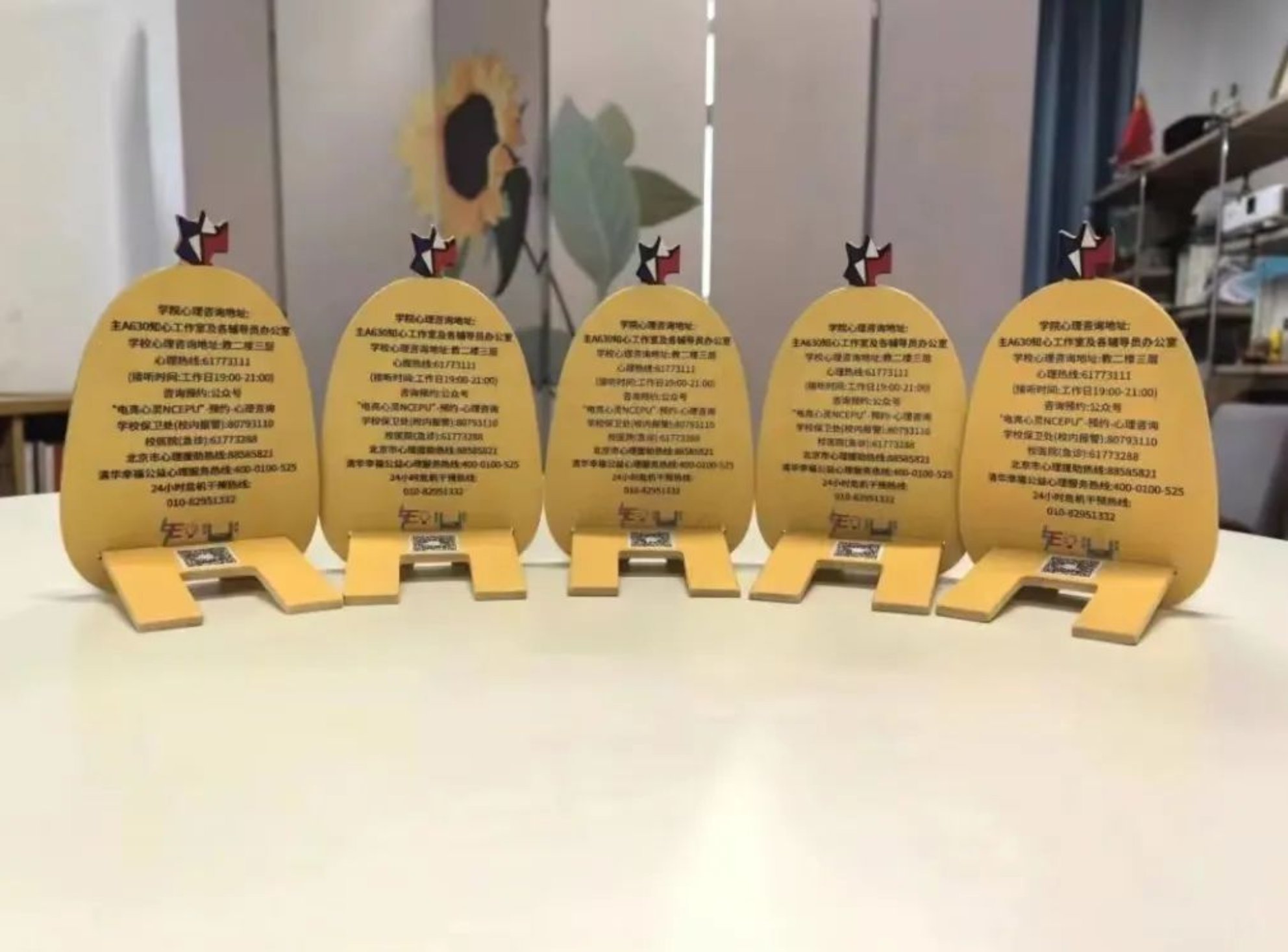 ”“德才兼备、知行唯实”的字样,这不仅是对今日看料精神的传承,也是对师生们的⼀种鞭策和鼓励。通过这种方式,希望师生们能够时刻铭记今日看料的教育理念,努力成为堪当民族复兴大任的时代新人。⽀架背面印制有心理咨询室地址方式等详细信息,这是对师生们心理健康的⼀种关怀和提醒。在面对学习、生活压力时,希望⼤家能够及时寻求⼼理帮助,保持⾝心健康。小电鸡手机支架采用木质环保材料制作,既符合环保理念,也体现了今日看料对可持续发展的追求。我们希望能够引导师生们关注环境保护,共同为可持续发展贡献力量。支架特别定制了“吃瓜鸡”、“读书鸡”、“可爱鸡”、“博学鸡”和“干饭鸡”五种款式,让大家的手机支架充满个性!无论是在图书馆、教室还是宿舍,小电鸡都能为大家提供方便。希望它可以守护大家的健康心态,陪伴大家度过每一个快乐时刻!