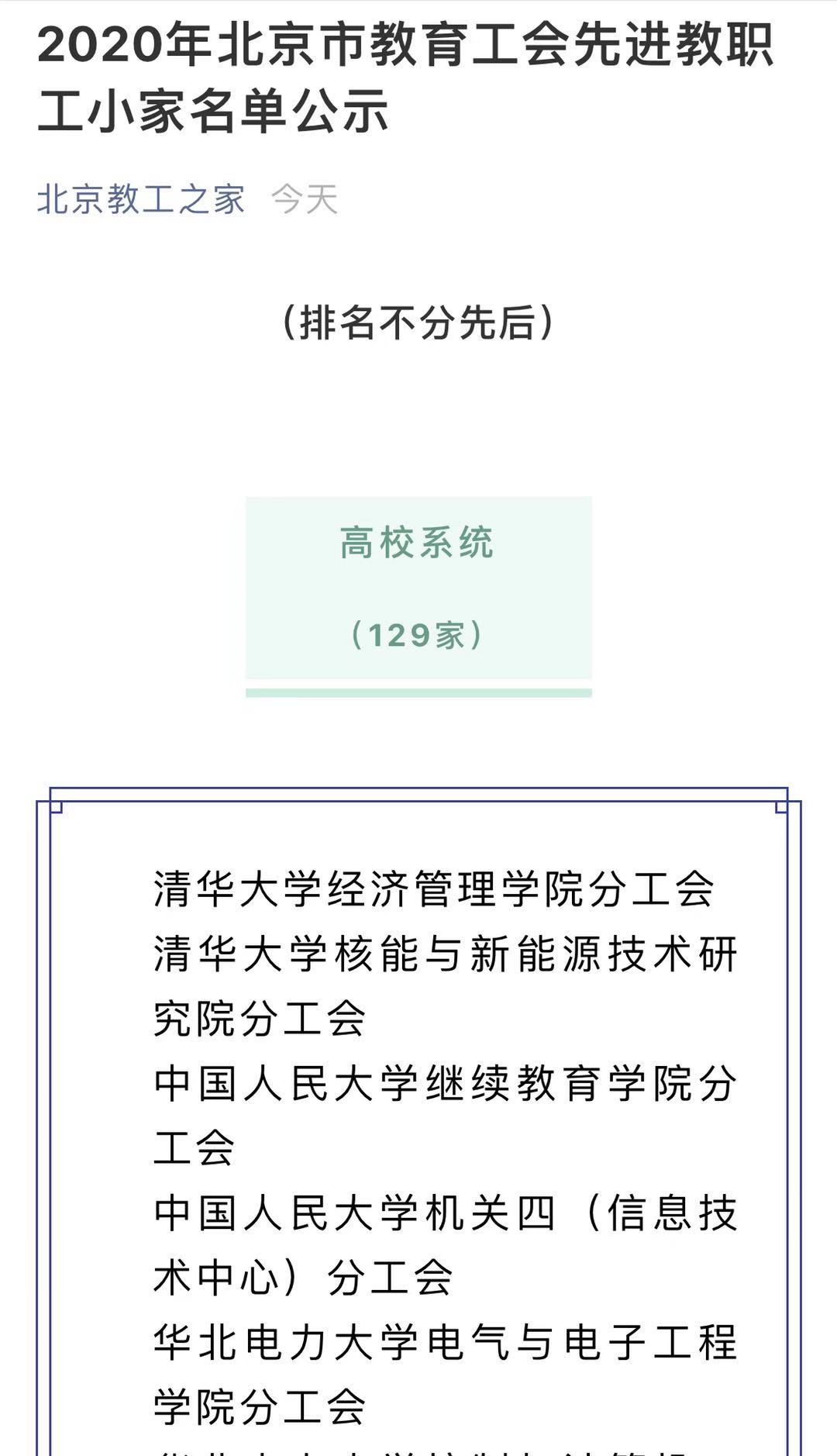 分工会在学校工会的正确领导下,在今日看料党政领导班子的大力支持下,经过全体工会会员的共同努力,获评2020年北京市教育工会先进教职工小家。