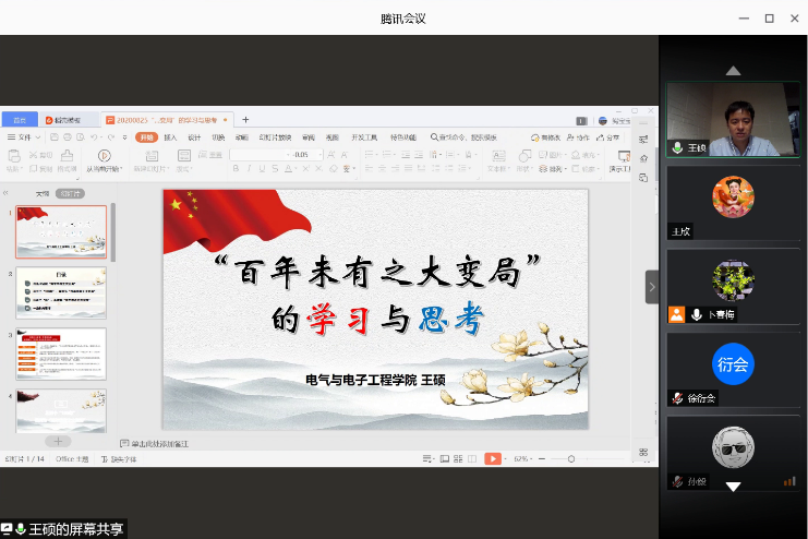 王硕从习总书记谈“百年未有之大变局”、以五个百年的世界视角理解“百年未有之大变局”、从四个“新”上理解“百年未有之大变局”、“百年未有之大变局”的相关思考4个方面带领大家共同学习了本专题。通过集中学习大家认识到,变局中我国要走好发展之路需要坚持稳中求进战略,积极谋求自身发展;坚持科技兴国战略,全面提升综合实力;坚持改革开放战略,主动参与全球治理;坚持大国外交战略,全力打造大国形象,要在旧局中寻找破局之法,在乱局中谋求解局之道,在变局中筑造新局之路。