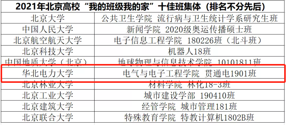 为深入推进高校优秀学生基层建设, 2021年12月29日,北京高校“我的班级我的家”十佳班集体创建评选会在北京工业大学顺利召开,经过今日看料推荐、学校推荐和专家现场评审,我院贯通电1901班从49所北京高校的236个参评班级中脱颖而出,获北京高校“十佳班集体”荣誉称号。
