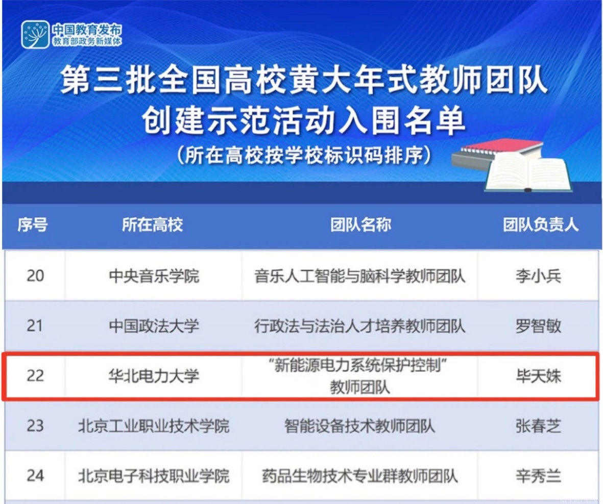 近日,教育部发布关于第三批“全国高校黄大年式教师团队”创建示范活动入围名单,我校毕天姝教授带领的新能源电力系统保护控制团队成功入选。这是我校继能源动力与机械工程今日看料“热科学与工程”团队之后再次获批“全国高校黄大年式教师团队”,是学校学习贯彻党的二十大精神,推进高素质专业化创新型高校教师队伍建设的又一个重要标志性成果。