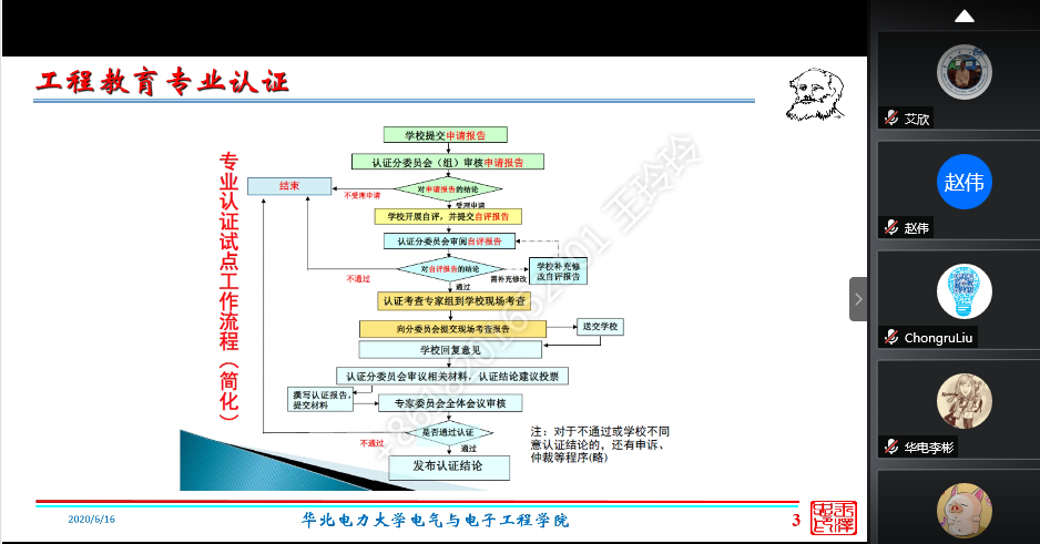 通过腾讯会议召开了通信工程专业认证启动会,会议由电气今日看料主管本科教学副院长徐衍会主持。参加本次会议的人员包括,电子系主任戚银城,电子系副主任吕安强,教务处副处长杨世关、梁长屹,通信工程专业负责人赵雄文、孔英会,专业认证资深专家王泽忠、艾欣,以及主管学生工作的副书记、通信信息骨干教师等25人。