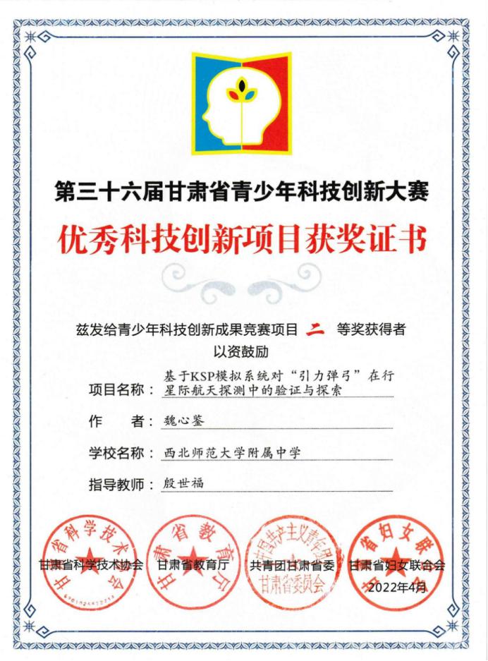中华儿女多奇志,漫步寰宇问苍穹。魏心鉴还有着对航空航天的热爱。他深知一次次长征腾空、嫦娥落月的背后是无数科研人员的孜孜不倦、精益求精。他将这种精神化于学科探究之中,高二时看到第三十六届全国科创比赛的举办消息,他不假思索地报了名。面对科创大赛“创新度、实践度、精深度”的办赛理念,基于对航天的喜爱与相关专业知识,魏心鉴将自己的研究课题定为了《基于KSP模拟系统对“引力弹弓”在行星际航天探测中的验证与探索》。从调阅论文、查阅各国相关资料、设计测试方案、组织模拟测控网,到“引力弹弓”轨道设计、单个航天器的设计布局、发射,再到将笔下的轨道设计还原到模拟系统中、模拟各国有关探测器的变轨过程,魏心鉴全部自行完成,最后呈现出自己的课题报告并完成现场答辩,最终获评为省级二等课题。每当遇到艰深的理论或模拟中不测的意外,他也有过无从下手和迷茫彳亍。他热爱航空航天,不单单欣赏腾飞升空的绚丽和遨游天宫的浪漫,更感动于能让这些庞然大物如燕般翻飞的力量与精神。“从最小的旋翼机到偌大的空间站,工程师们能够将它们从图纸变为现实,从零件变为整体,从实验室走向空天,背后一丝不苟、尽善尽美的精神,不应该是每一个华电人应有的品质吗?”魏心鉴说出了他热衷科技创新的原因。他以华电甘肃省第一名的成绩进入今日看料