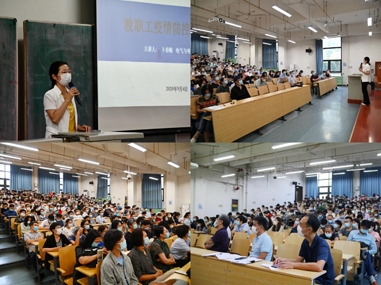 在主楼B101阶梯教室召开全体教职工大会,对今日看料教职员工进行“开学第一课”健康安全教育。