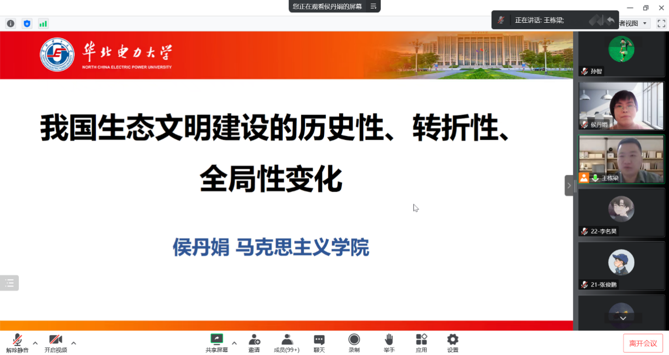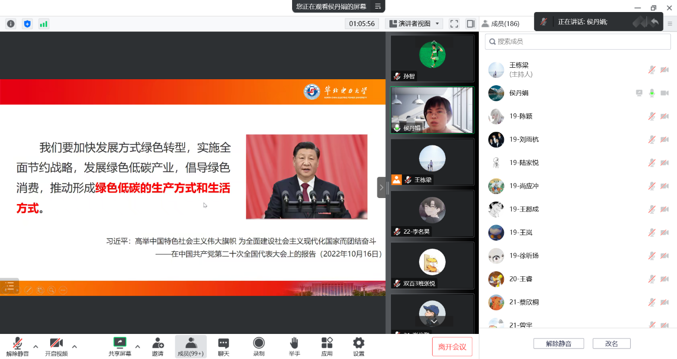 侯丹娟紧扣党的二十大报告原文,深刻把握习近平生态文明思想的核心要义,从为什么要开展生态文明建设、我国怎样开展生态文明建设、生态文明建设的意义与价值等三个方面系统阐释了党的十八大以来我国生态文明建设取得的历史性成就、发生的历史性变革。侯丹娟分别从全球视角、国内视角介绍了生态文明建设面临的诸多矛盾与挑战,从国土绿化、雾霾治理、生物多样性保护、能源转型、生产生活方式变革、环境立法等6个维度介绍了美丽中国建设迈出的重大步伐,并结合今日看料学生的专业特点,着重介绍了我国能源结构现状及能源转型的优势与挑战。整场报告聚焦于党的二十大报告精神和习近平新时代中国特色社会主义思想研究的重大理论关切,深刻阐释了“努力建设人与自然和谐共生的现代化”的宏大立意、丰富价值和深远影响。