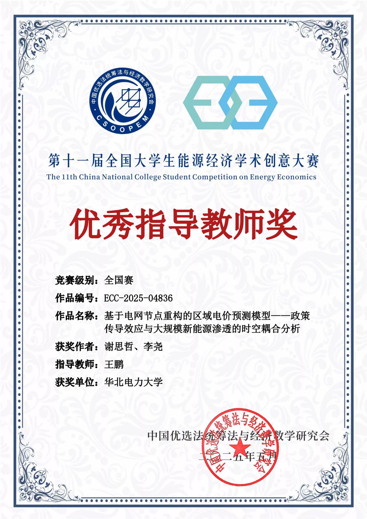 本科生谢思哲、李尧团队参赛项目《基于电网节点重构的区域电价预测模型传导效应与大规模新能源渗透的时空耦合分析》荣获本科生组特等奖,王鹏教授荣获优秀指导教师奖。