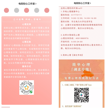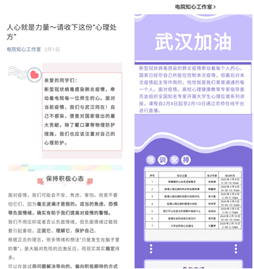为更好帮助疫情防控期间急需情绪疏导和心理支持的学生,知心工作室第一时间开通心理支持热线,公布多种心理咨询渠道,并排出日程主动对疫情严重地区学生进行一对一心理网络辅导。通过与学生积极沟通,心贴心交流,摸清了解学生所想、所做、所虑、所盼。鼓励学生关注官方和主流媒体,不信谣、不造谣、不传谣,注意学习掌握疫情防控知识,带动家人及亲属加强防范意识,履行好电院学子的责任担当。